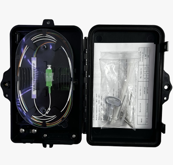 Caja de terminación de FTTH 4FO IP65 cargada con Splitter 1*4 SC/APC + 4 Adaptadores SC/APC, Negra